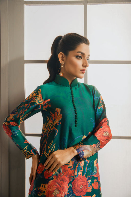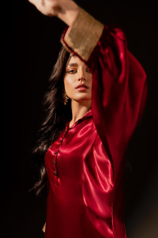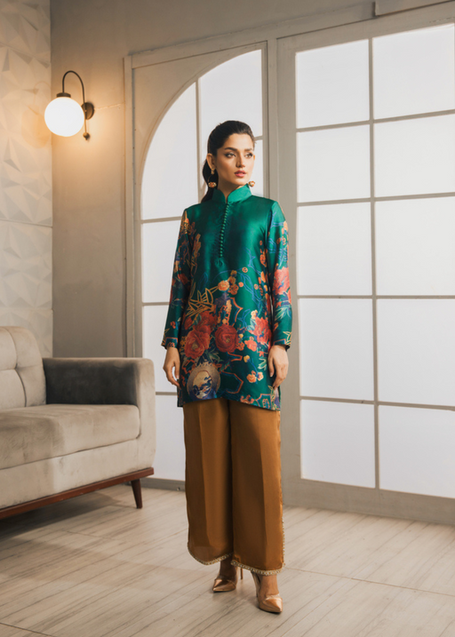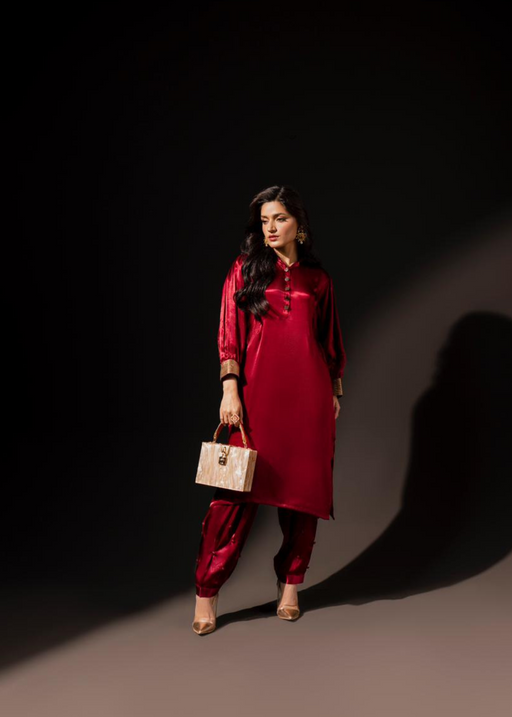 Fabric: Imported premium pure silk Two piece set (shalwar and kameez) The shirt features a stylish cloverleaf collar neckline embellished with glea...