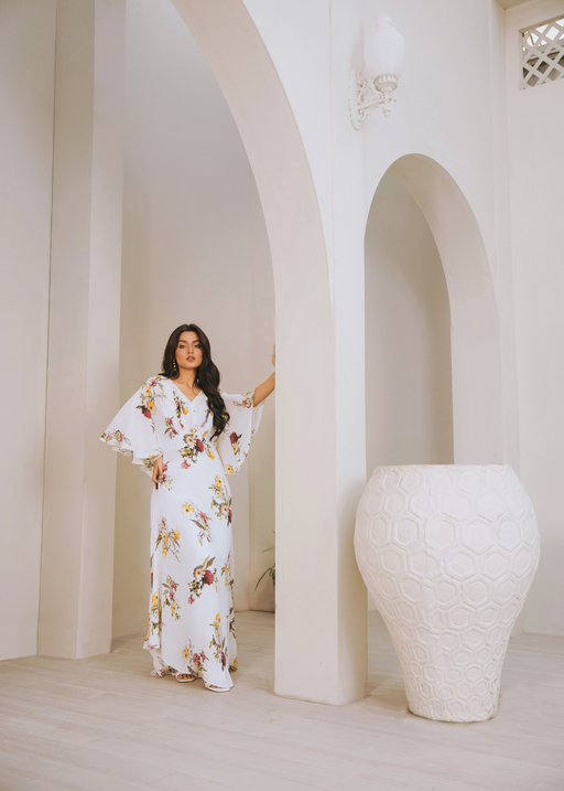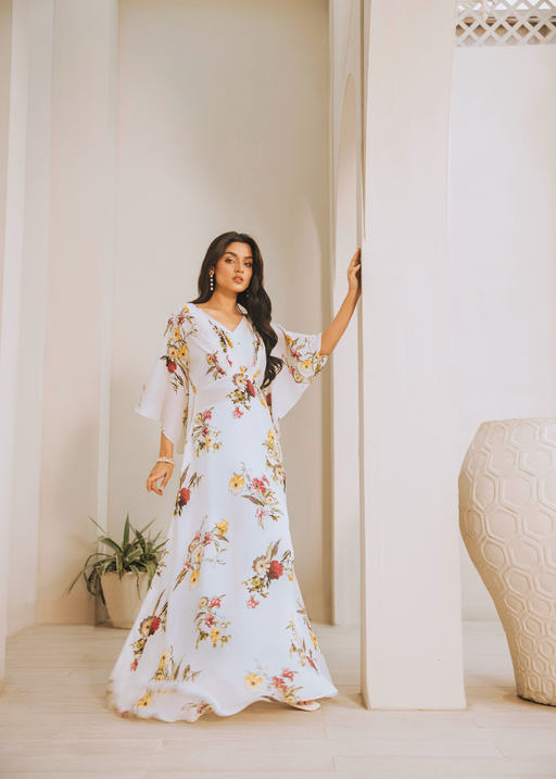 Fabric: Imported georgette chiffonColor: White One piece (only maxi) This white maxi dress is stunning. It features flounce sleeves that add a to...